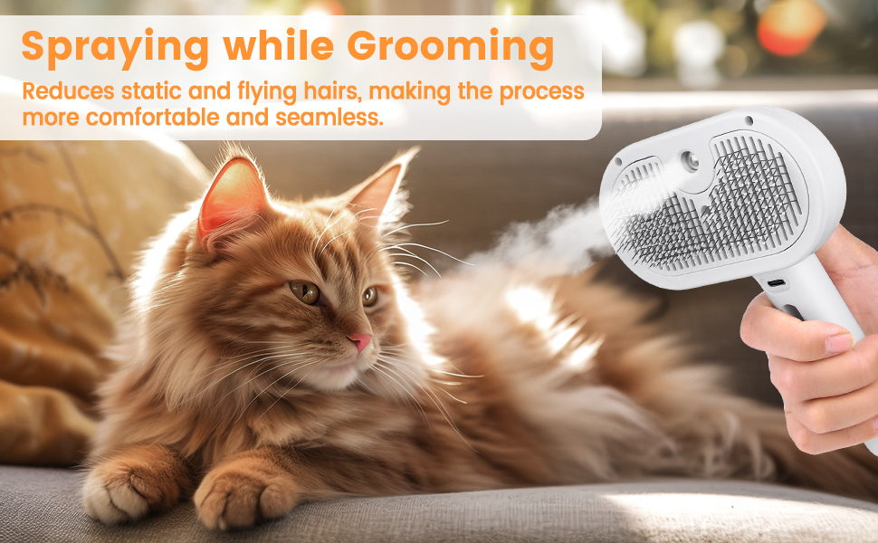 💦 Gentle Mist Spray Function: Spray a fine mist while brushing to reduce static and flying hair. Helps detangle knots and adds moisture for a smoother, more comfortable grooming experience.( ⚠️ Note: Our cat brush only turns water into mist, not heating water into hot vapor. )